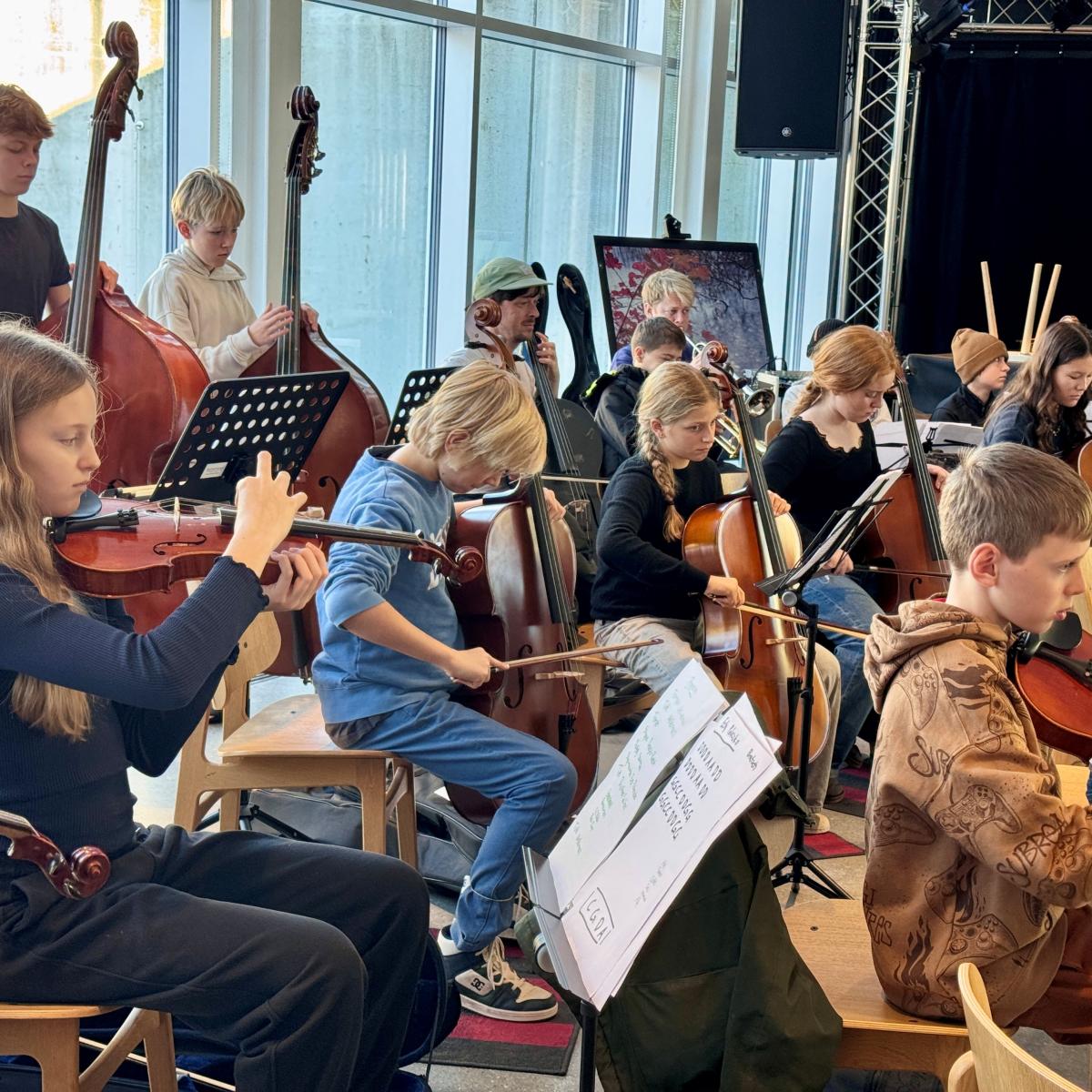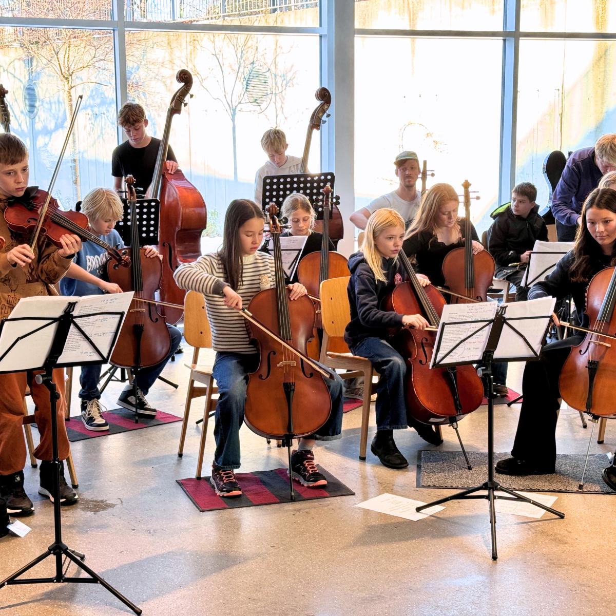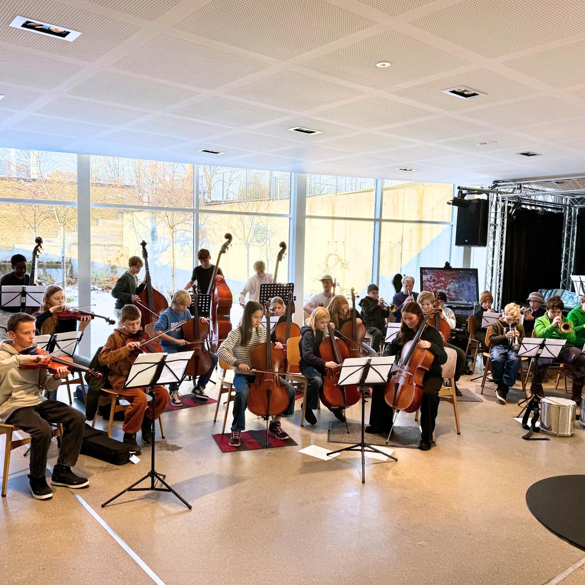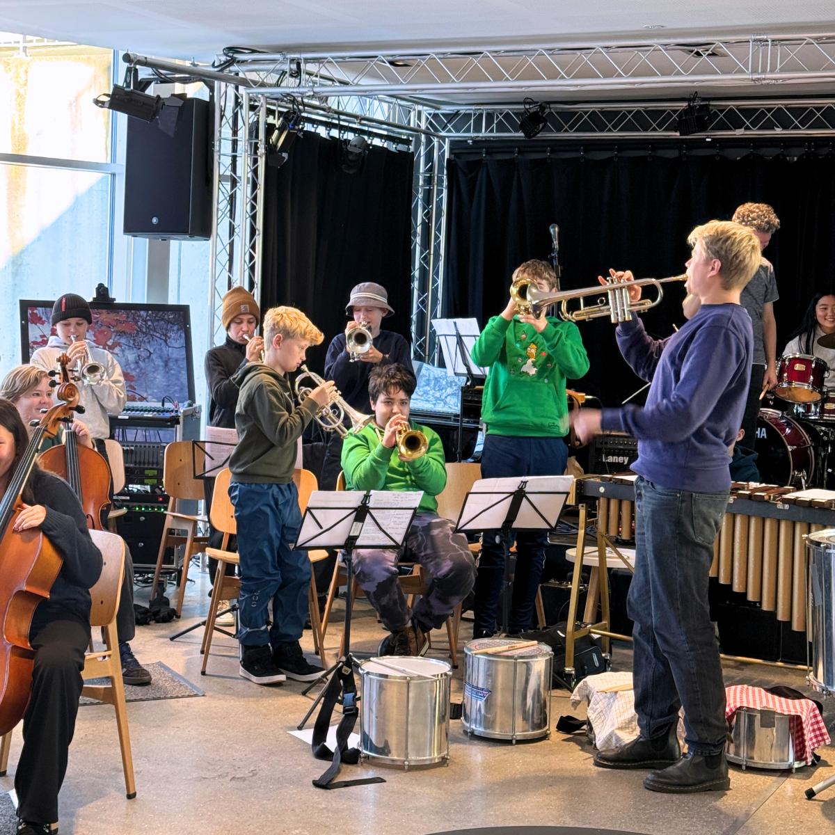 I caféen på Kulturcenter Mariehøj er elever fra 6. klasse i gang med generalprøven, inden de senere skal spille koncert for deres forældre på cello, kontrabas, bratsch, slagtøj og trompet. De følger Trompetlærer Erik, da han spiller for: ”trut trut truuut”. Et øjeblik senere svarer en gruppe drenge igen med et højt “TRUUUUT” og bryder ud i grin. Det er ikke alle toner, der sidder lige i skabet, men energien gør. Kort efter spiller alle med.