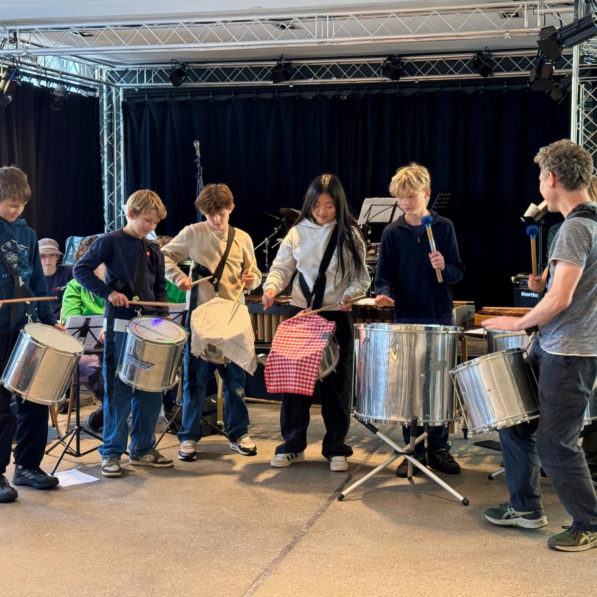Helt til højre sidder Vivian, der i forvejen går til slagtøj på musikskolen. Hun har i løbet af ugen stået for rytmerne på trommesæt, marimba og vibrafon: